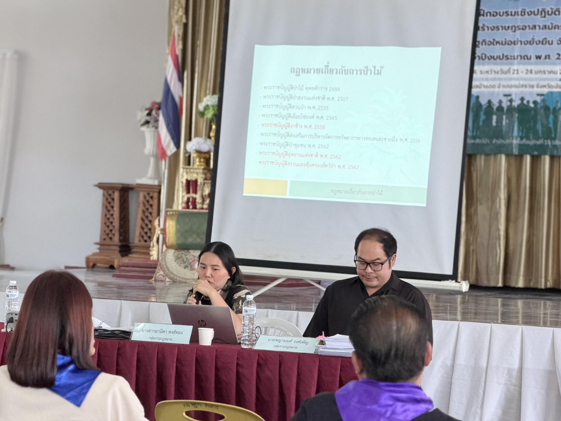 21 มกราคม 2569 กลุ่มงานกฎหมาย โดย นางสาวมานิตา หงษ์ทอง นิติกรชำนาญการ นายชญานนท์ วงค์เพ็ญ นิติกรปฏิบัติการ และนางสาวทฤษฎีกานต์ ภู่เจริญ นิติกร ได้เข้าร่วมการฝึกอบรมเชิงปฏิบัติการ กิจกรรมเสริมสร้างราษฎรอาสาสมัคร รุ่นที่ 4 เพื่อพิทักษ์ป่าด้วยโมเดลเศรษฐกิจใหม่อย่างยั่งยืน ภายใต้โครงการส่งเสริมเชียงรายเมืองด้านความมั่นคง เพื่อรองรับการพัฒนาทางสังคมตามแผนปฏิบัติราชการประจำปีงบประมาณ พ.ศ. 2569 โดยเป็นการบรรยายให้ความรู้เกี่ยวกับกฎหมายการป่าไม้ เช่น พ.ร.บ.อุทยานแห่งชาติ พ.ศ. 2562 พ.ร.บ. สงวนและคุ้มครองสัตว์ป่า พ.ศ. 2562 และ พ.ร.บ.ป่าไม้ พ.ศ. 2484 รวมถึงระเบียบที่เกี่ยวข้อง ณ อาคารปฏิบัติธรรมรัตนบัณฑิตศิริสมบูรณ์ ตำบลป่าแดด อำเภอแม่สรวย จังหวัดเชียงราย