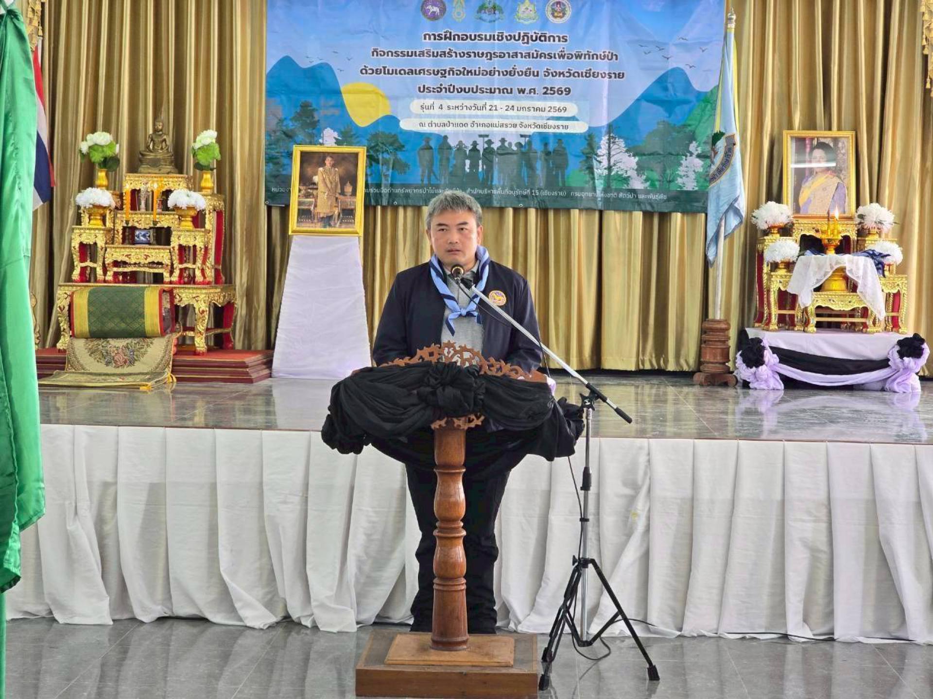 24 มกราคม 2569 ส่วนประสานความร่วมมือด้านทรัพยากรป่าไม้และสัตว์ป่า สำนักบริหารพื้นที่อนุรักษ์ที่ 15 (เชียงราย) สรุปผลการปฏิบัติงาน การจัดการฝึกอบรมเชิงปฏิบัติการ กิจกรรมเสริมสร้างราษฎรอาสาสมัครเพื่อพิทักษ์ป่าด้วยโมเดลเศรษฐกิจใหม่อย่างยั่งยืน จังหวัดเชียงราย รุ่นที่ 4 ระหว่างวันที่ 21–24 มกราคม 2569 ณ อาคารปฏิบัติธรรมรัตนบัณฑิตศิริสมบูรณ์ ตำบลป่าแดด อำเภอแม่สรวย จังหวัดเชียงราย โดยมีราษฎรในพื้นที่เข้าร่วมการฝึกอบรม จำนวน 100 คน วันที่ 22 มกราคม 2569 นายจิตกร คูสินไทย ปลัดอำเภอฝ่ายความมั่นคง อำเภอแม่สรวย เป็นประธานในพิธีเปิดการฝึกอบรม โดยมีหน่วยงานฝ่ายปกครองท้องถิ่น นำโดย นายสมพงษ์ อินต๊ะชัยวงค์ กำนันตำบลป่าแดด ผู้แทนจากสถานีตำรวจภูธรอำเภอแม่สรวย และผู้แทนหน่วยงานภาคสนาม ได้แก่ นายปัณณวัฒน์ ไชยภักษา หัวหน้าโครงการบ้านเล็กในป่าใหญ่ตามพระราชดำริ บ้านห้วยหญ้าไซ จังหวัดเชียงราย ร่วมเป็นเกียรติในพิธีเปิด การฝึกอบรมดำเนินไปตามกำหนดการและเสร็จสิ้นในวันที่ 24 มกราคม 2569 โดยมี นายธารางกูร สุภาวงค์ ปลัดอาวุโสอำเภอแม่สรวย เป็นประธานในพิธีปิด